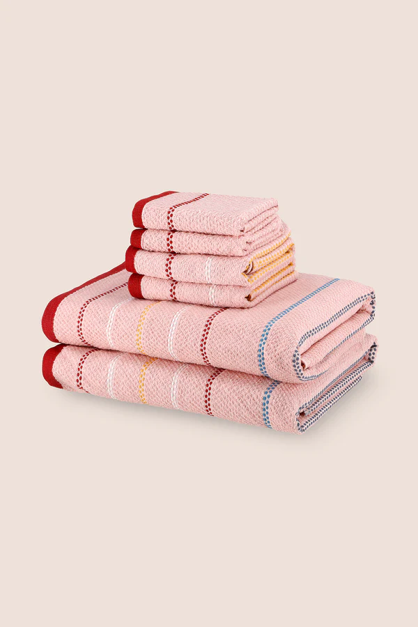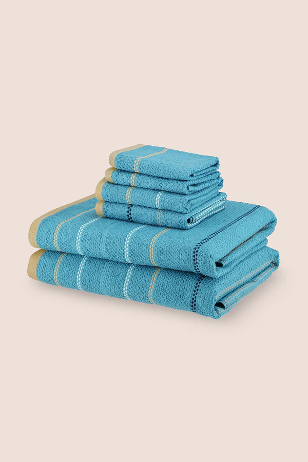 This Towel Set Pack of 6 including: 2 Bath Towels, 2 Hand Towels & 2 Face Towels. Made with yarn dyed fabric, these towels are soft, absorbent, and durable – perfect for everyday use. Upgrade your bath linen collection with this high-quality towel set.